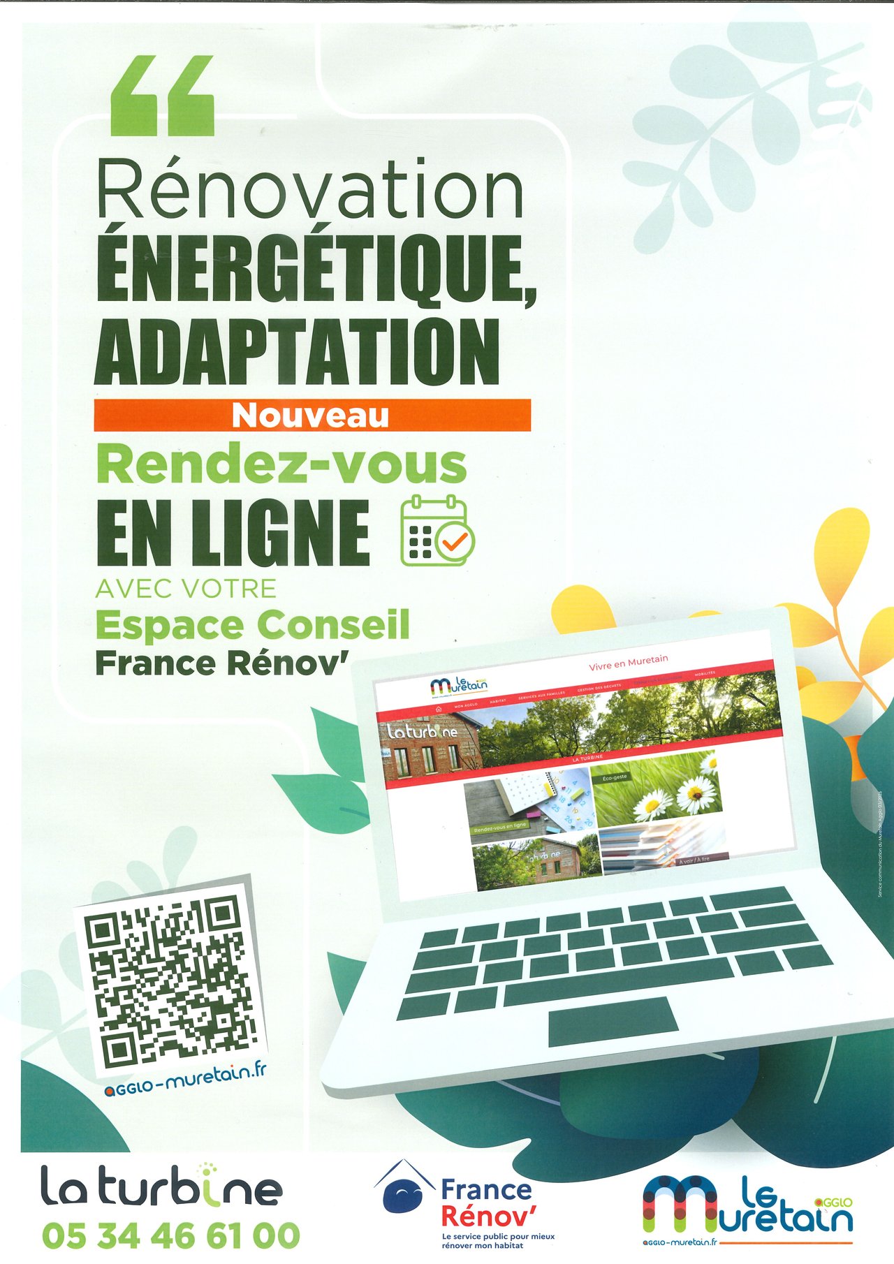 Un nouveau rendez-vous en ligne a été mis en place avec votre Espace Conseil France Rénov. Vous pouvez vous renseigner à La Turbine au 05 34 46 61 00 ou en scannant le QR Code