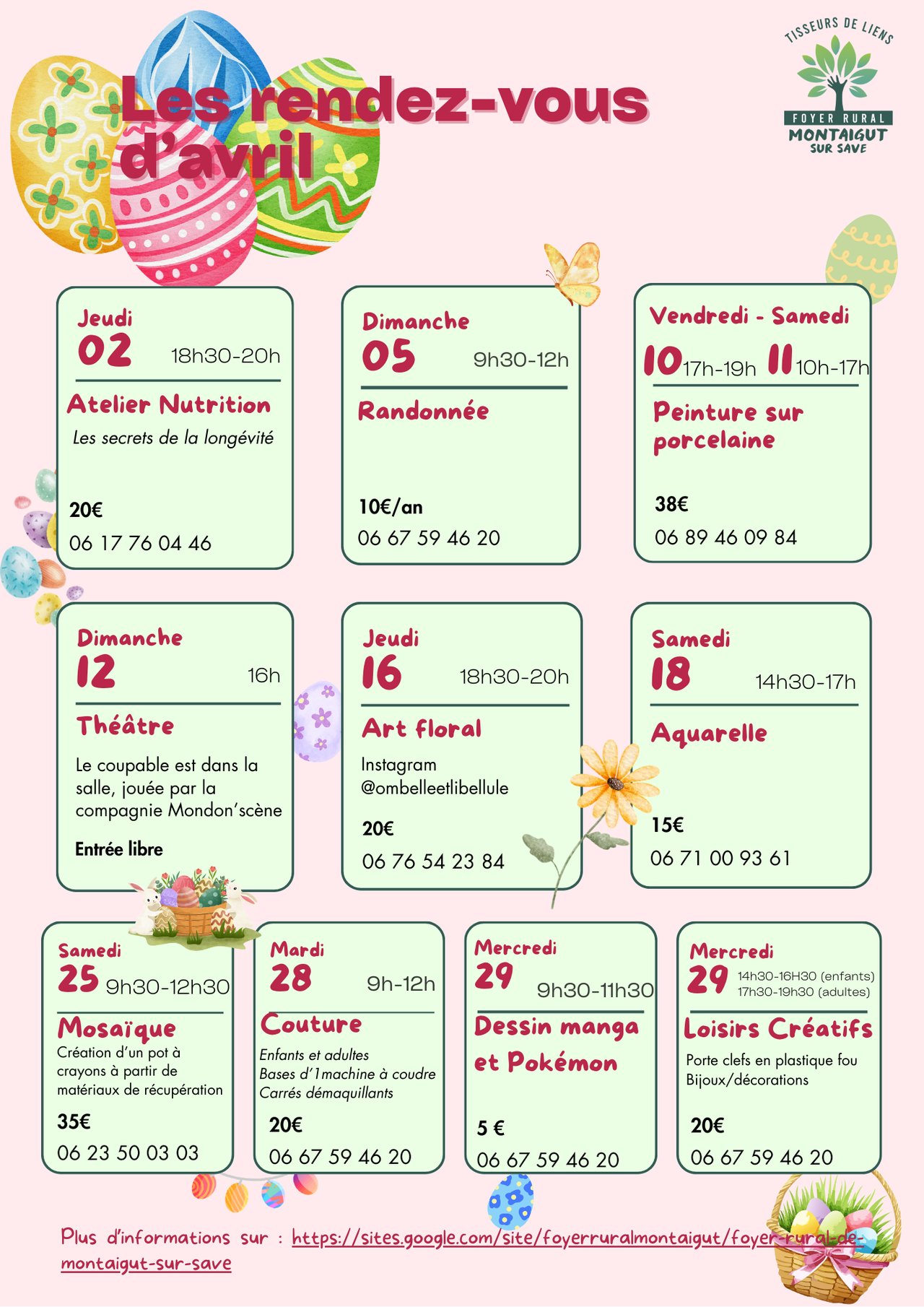 Inscription et renseignements auprès de Danielle (06 67 59 46 20). Elle vous indiquera le matériel à apporter.