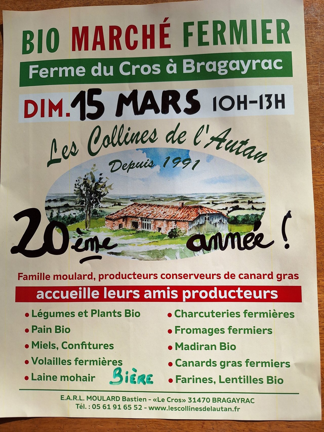 Les Collines de l'Autan accueille leurs amis producteurs, à la ferme du Cros, le Dimanche 15 Mars à l'occasion de leur traditionnel marché fermier.
